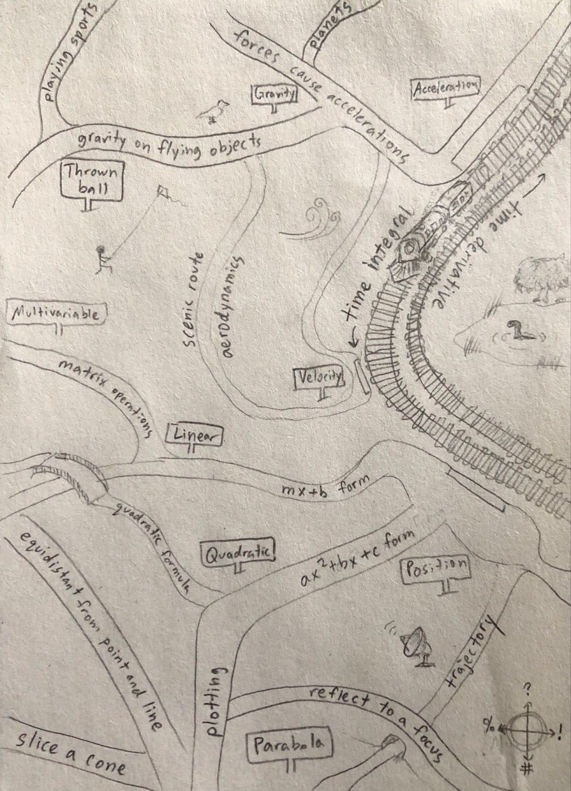 Models are never perfect, but I like that the imaginary atlas captures that there is often more than one path to a topic, and paths go both ways. To get to parabolas, you don’t have to start with throwing balls—you could be designing a radar dish, or slicing a cone. Conversely, you don’t have to learn about parabolas and their ability to focus waves before you start to think about throwing balls.