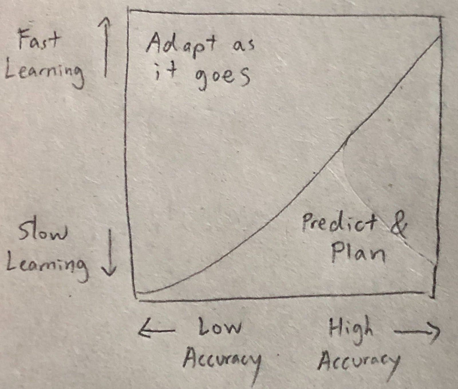I believe that there is a trend of our environment moving to the upper left of the plot, with the world moving faster making it harder to make accurate predictions, and new tools making it possible to gather information about something in a few minutes that might have taken previous generations days.