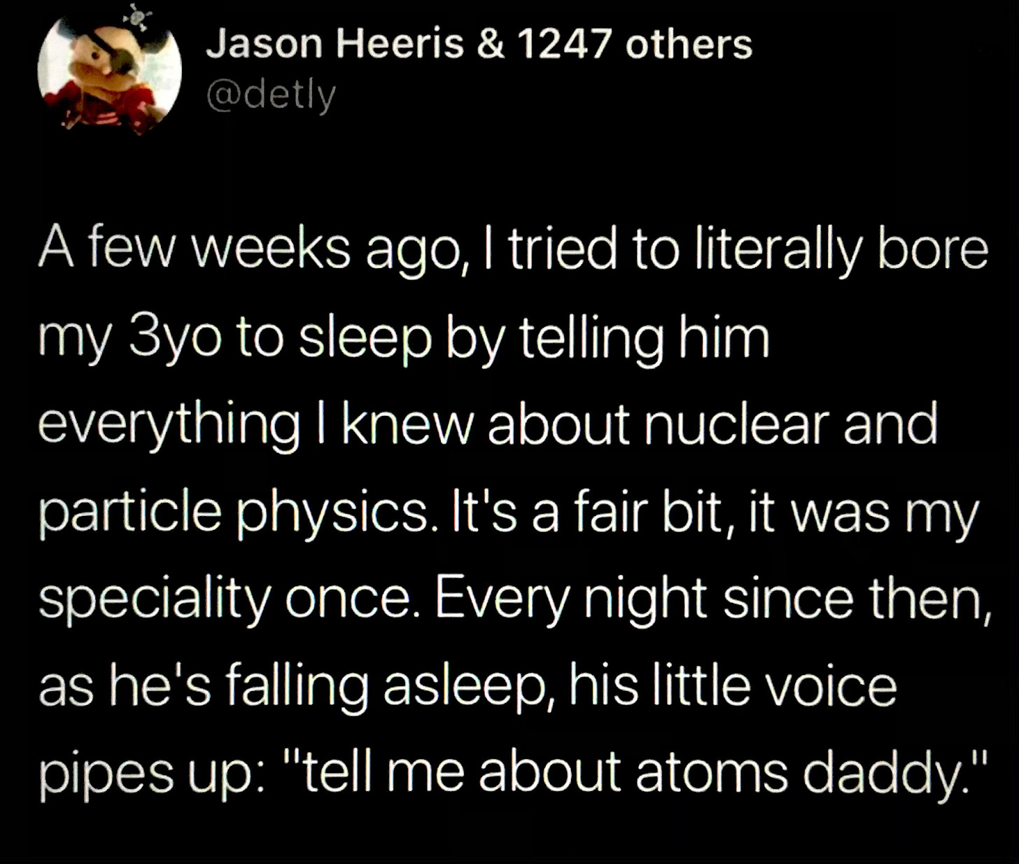 I can’t be sure this actually happened, but I would believe it. From the fresh perspective of any toddler, how is the concept of quarks more unreachable than dinosaurs, or fairies?